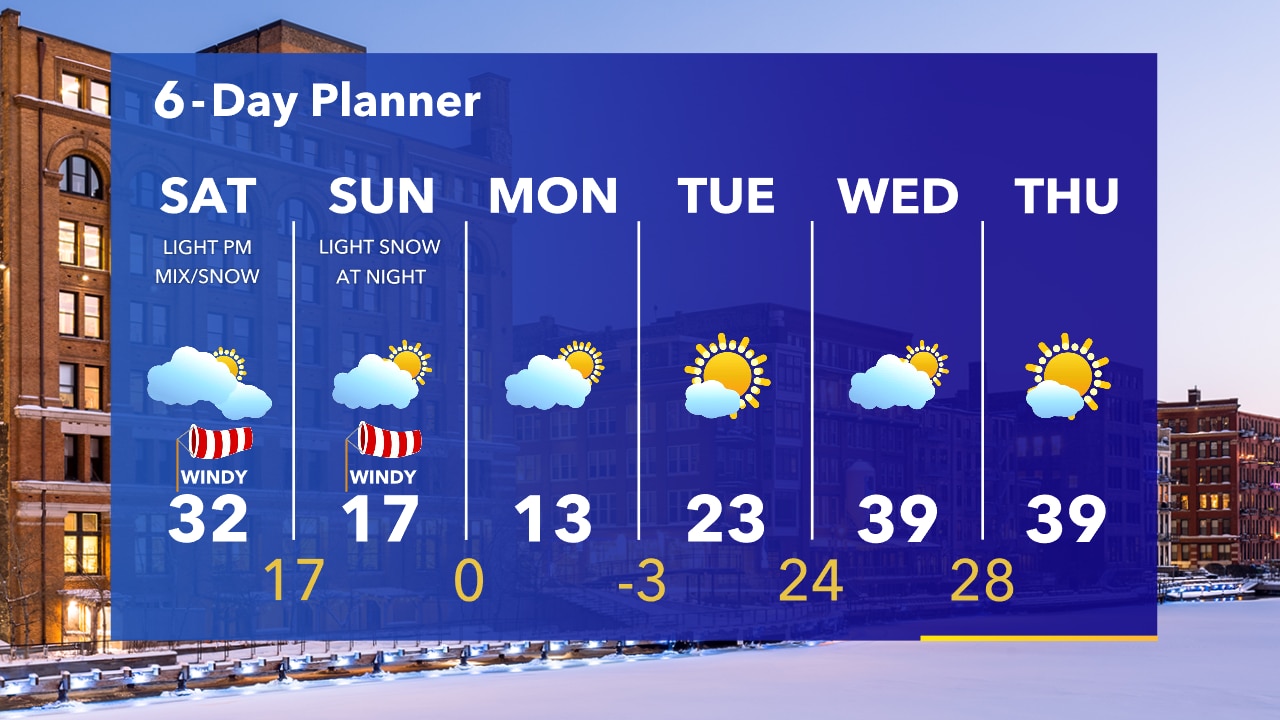 Cold overnight with temperatures in the single digits. The wind will pick up overnight and throughout the day Saturday. Warmer with highs around freezing. Light freezing rain or drizzle possible late Saturday afternoon.