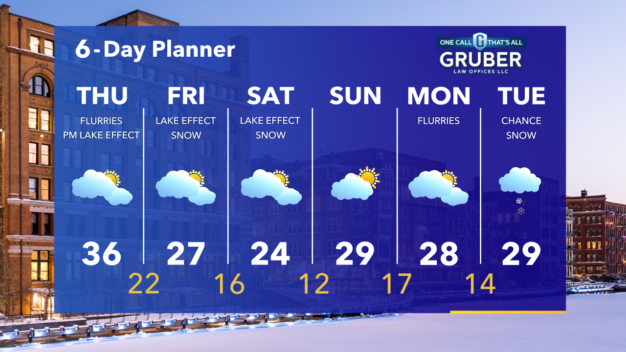 Increasing clouds tonight with some patchy freezing fog possible. Temperatures will drop into the 20s. Flurries possible on Thursday with a mild high in the middle 30s. Lake effect snow is possible after 9pm Thursday night.
