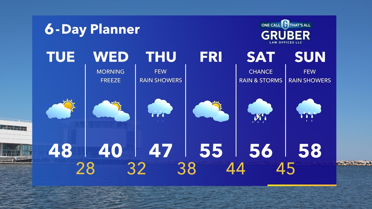 Cloudy and cool tonight. Temperatures falling into the 30s. Partly to mostly cloudy on Tuesday with a high in the upper 40s.