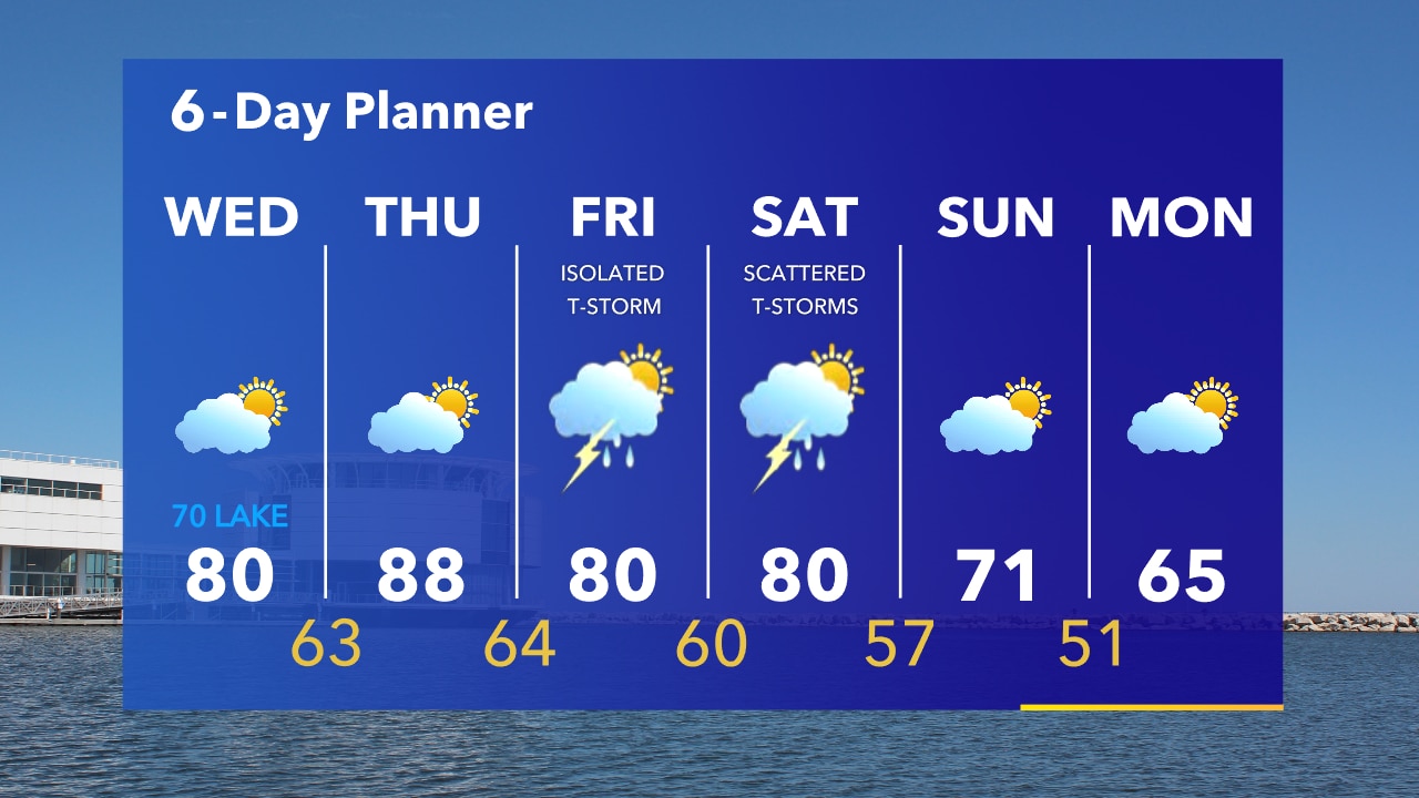 Slim chance for a t-storm for the rest of the night. Muggy with temperatures in the 70s. More warm days ahead, cooler along the lakeshore.