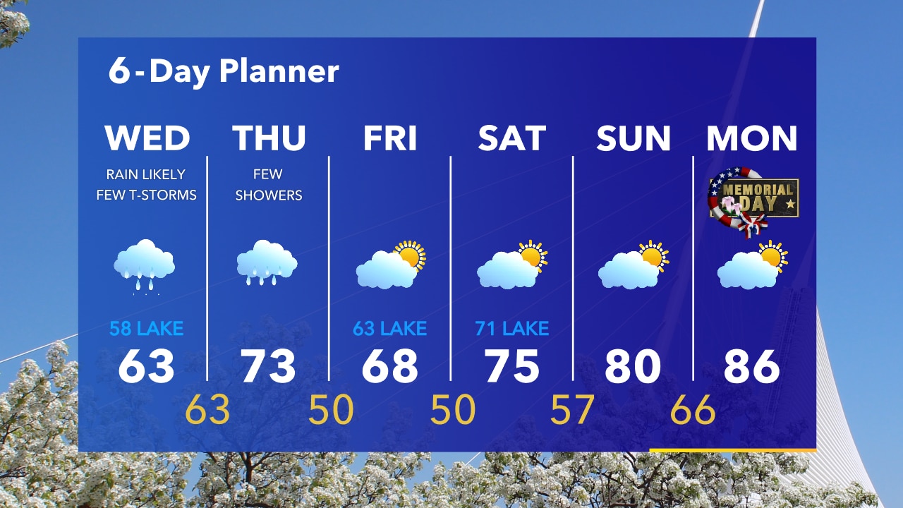 Rain moving in from the south after 8-9am and continuing through midday. Temperatures in the 50s to low 60s on Wednesday. Scattered afternoon rain showers.