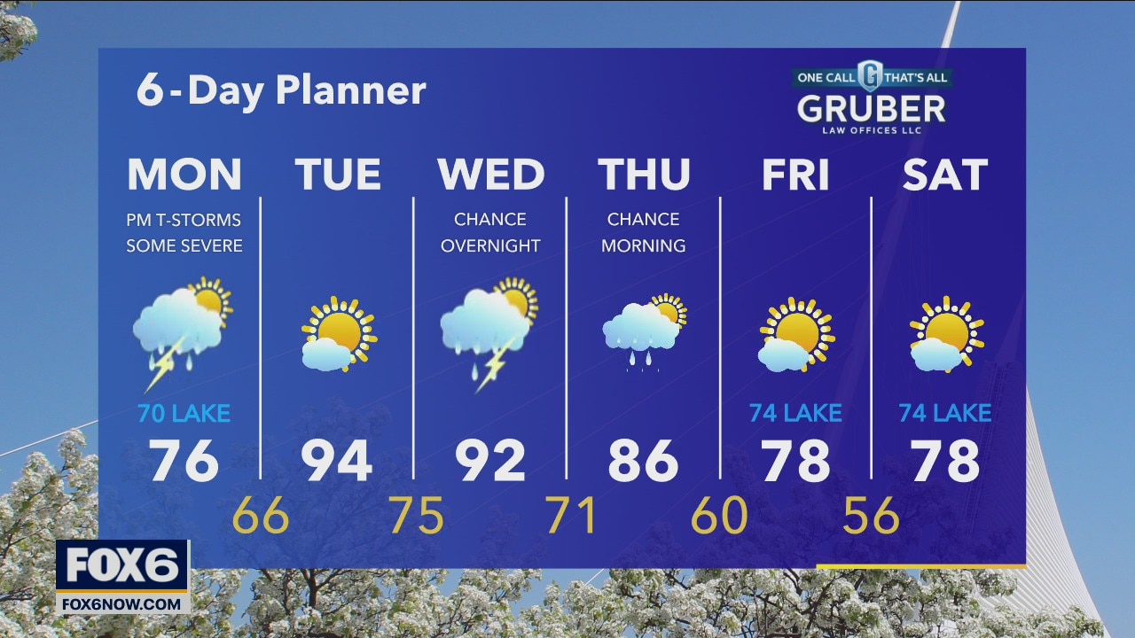 Watching a strong complex of storms and a warm front over the next 24 hours. The complex of storms moving in later this morning through the afternoon is capable of producing strong to severe storms. We have a SLIGHT risk of severe storms today per the Storm Prediction Center. Highs today will be in the low to mid 70s inland but cooler near Lake Michigan. We will warm well into the 90s tomorrow with high dewpoints. A Heat Advisory goes into effect Tuesday at 11am.