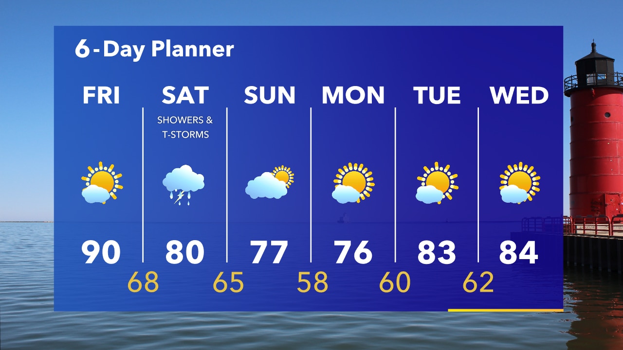 Beautiful first night of Summerfest. Clear skies and temperatures falling into the 60s. Sunny, hot and humid on Friday with a high around 90. Rain chances return Saturday.