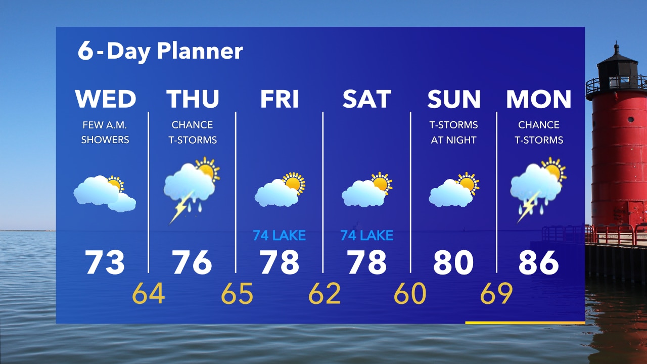 Showers and t-storms ending overnight. Some fog possible near the lake Wednesday morning as well. Temperatures in the 60s. Humid and cooler on Wednesday with highs in the low 70s, 60s along the lakeshore.