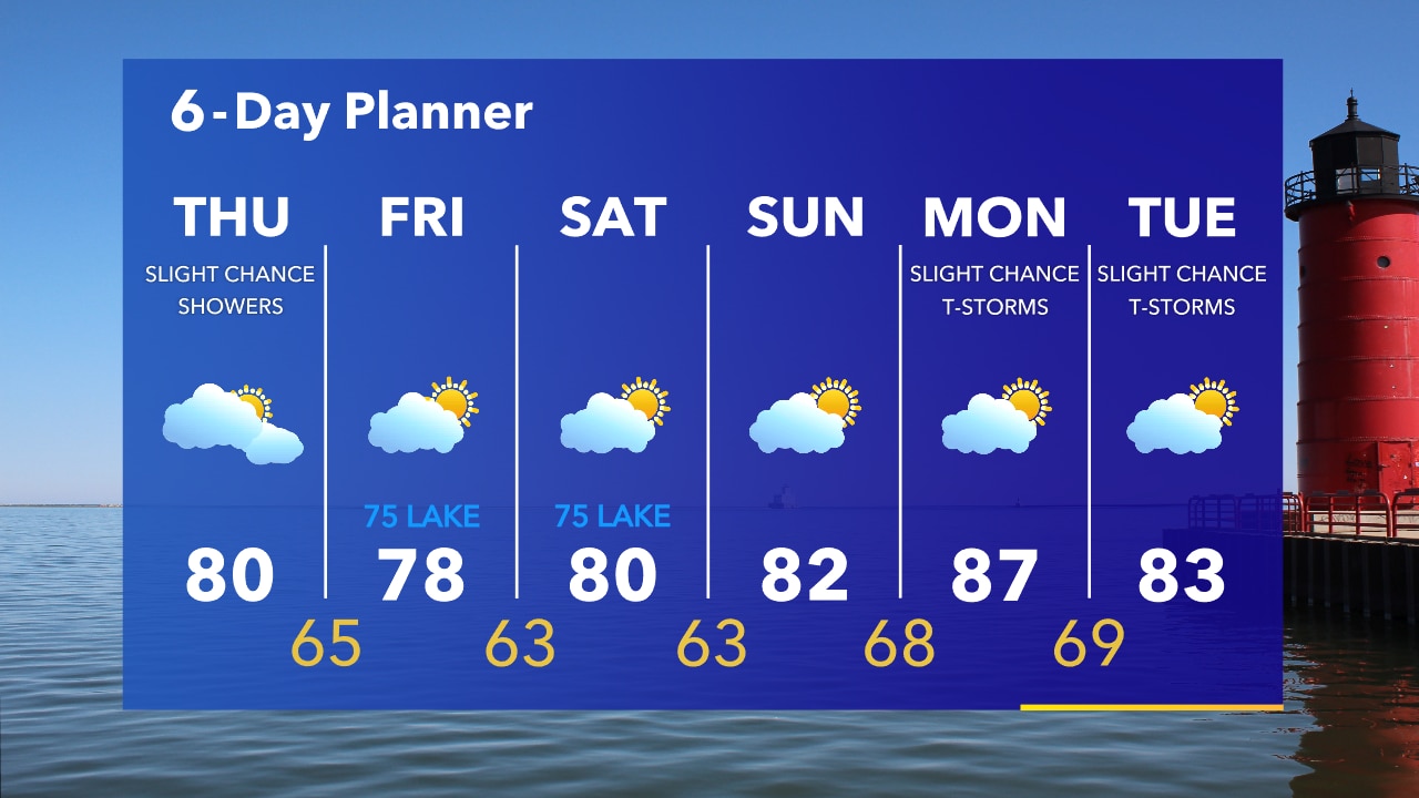 Partly cloudy skies overnight with temperatures in the 60s. Increasing clouds on Thursday with a high around 80. Slight chance for an afternoon rain shower.