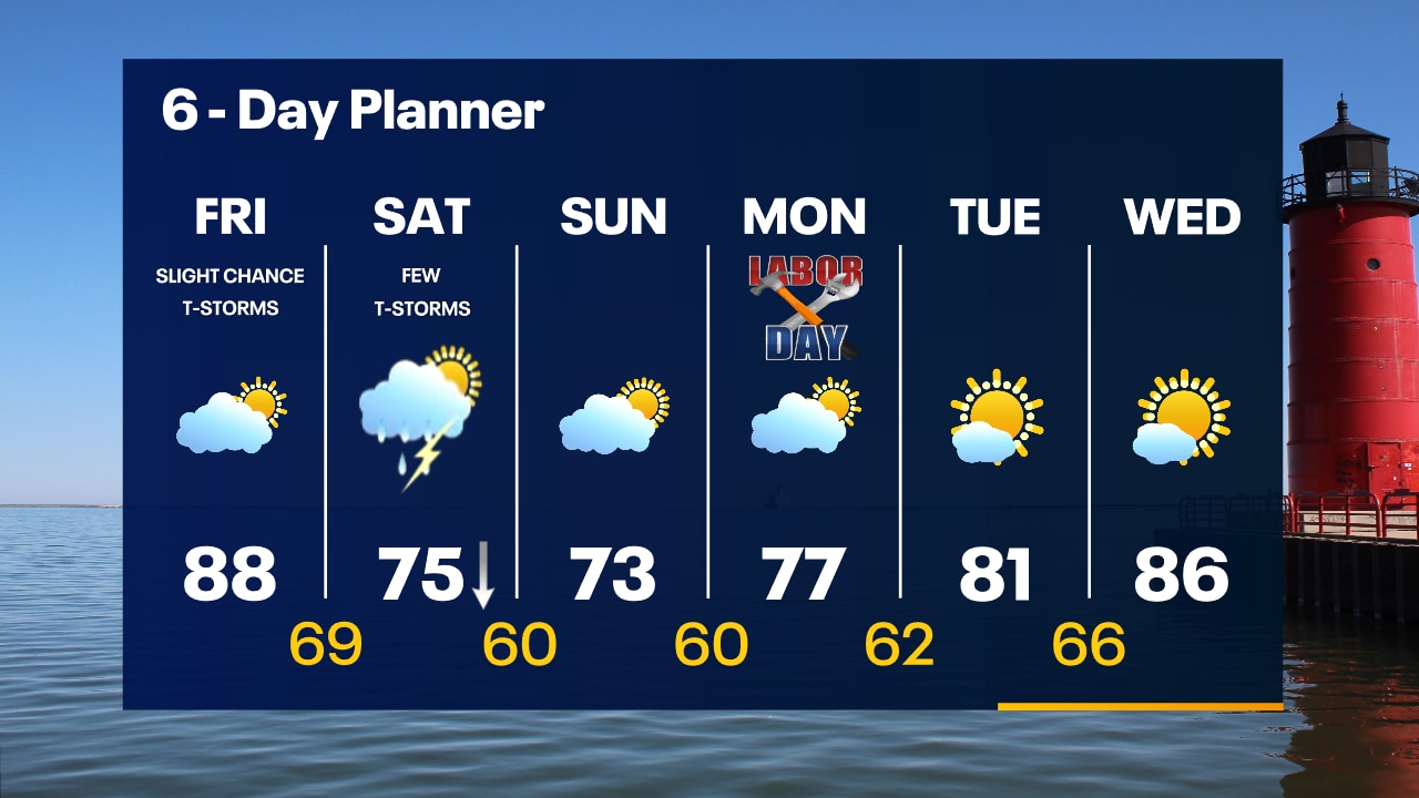 Partly cloudy overnight with temperatures falling into the 60s. There is a slight chance for a t-storm on Friday, otherwise warm and humid with highs in the upper 80s.