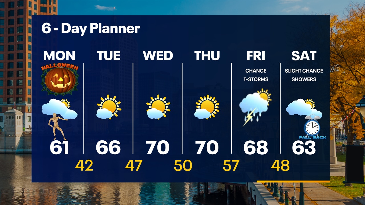 Patchy fog and spotty light rain showers overnight. Temperatures dropping into the 40s. Morning clouds on Monday with gradual afternoon clearing. Highs in the low 60s.