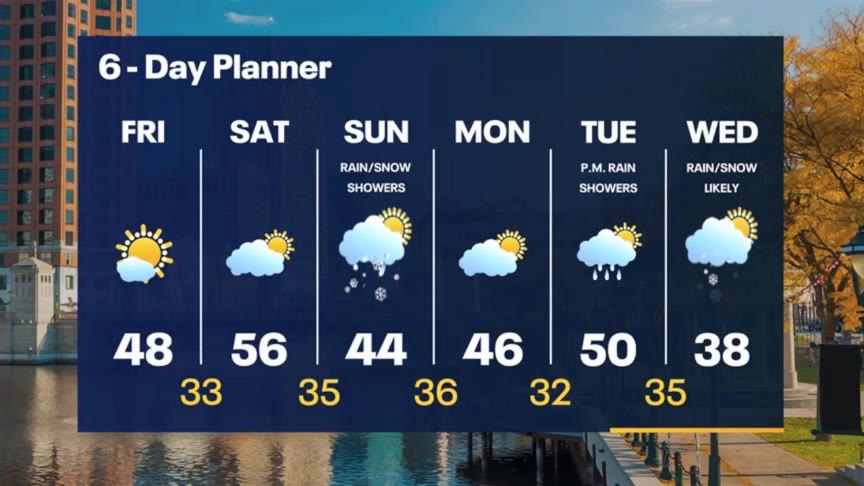 Clearing clouds Friday morning with plenty of sunshine through Saturday, plus warmer! Rain and some snow likely on Sunday then a bigger system will bring rain changing to snow Tuesday into Wednesday.
