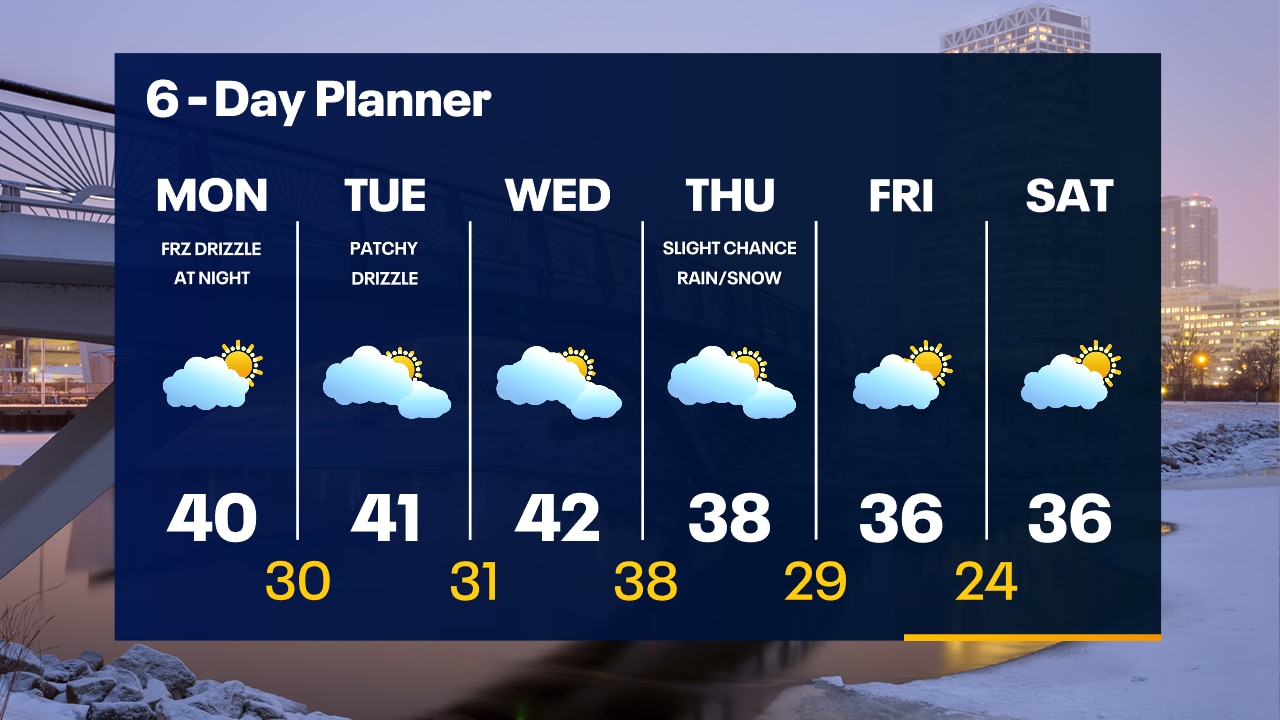 Clearing skies tonight and chilly with temperatures in the 20s. Partly sunny and warmer on Monday with a high around 40. Freezing drizzle is possible Monday night.