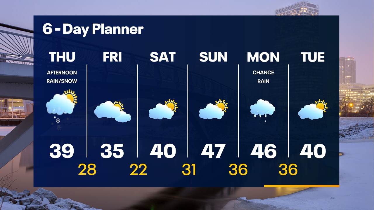 Areas of fog overnight with temperatures in the 30s. Mostly cloudy on Thursday and breezy. Scattered afternoon and evening rain/snow showers. Highs in the upper 30s.