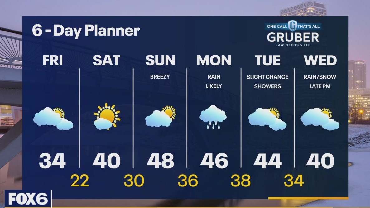 A mostly cloudy start with a few flurries possible. We should clear our later today and tonight. Temperatures will be in the low to mid 30s this afternoon and fall into the teens and low 20s overnight for one of the coolest nights in several days. We warm back to near 40 by Saturday afternoon and into the upper 40s by Sunday afternoon with partly sunny conditions both days. A low moves our way on Monday with rain likely as we stay mild. We remain in the 40s for thighs through the middle of next week.
