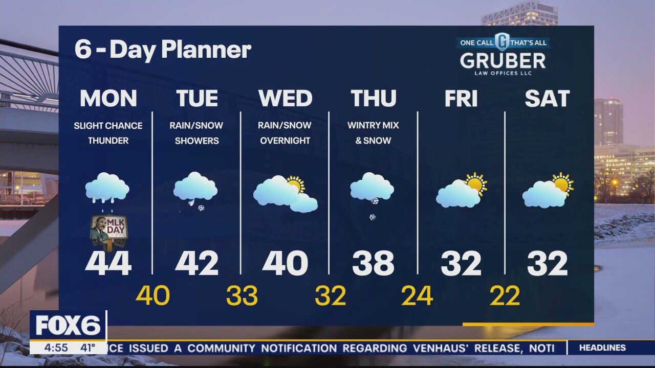 A low moving our way today will bring showers this morning with steadier rain and a chance for thunderstorms this afternoon and early evening. We should taper to showers late evening and overnight. Highs will be in the low to mid-40s today, and we will stay mild overnight with highs in the 40s again tomorrow.