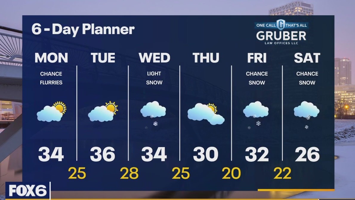 A few flurries are possible today but otherwise mostly cloudy and becoming windy with afternoon wind gusts in the 30mph range at times. Temperatures will remain slightly above average in the low to mid 30s today and warm slightly to the mid to upper 30s Tuesday. Our next round of snow arrives on Wednesday with a chance for a couple of inches - mostly in our south and east counties. We cool the low 30s - near seasonal - Thursday and Friday and drop into the 20s Saturday.