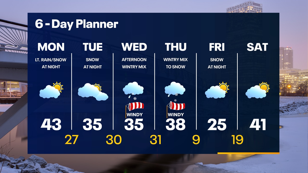 A few clouds tonight with temperatures falling through the 30s. Mild on Monday before a winter storm of freezing rain, sleet and snow moves in mid-week.