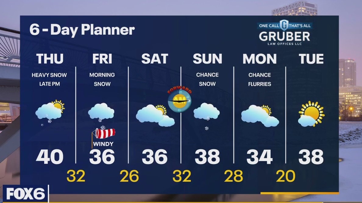 Winter Weather Advisory and Winter Storm Warning from 6pm Thursday to early Friday for all of our viewing area. Snow will start in the afternoon and evening and continue into the midday on Friday. Most areas will see around 4-6" worth of snow with some areas nearest to Lake Michigan in a 5-9" range. We start cloudy and mild buy only warm slightly to a high near 40. We cool into the mid to upper 30s Friday and through the weekend.