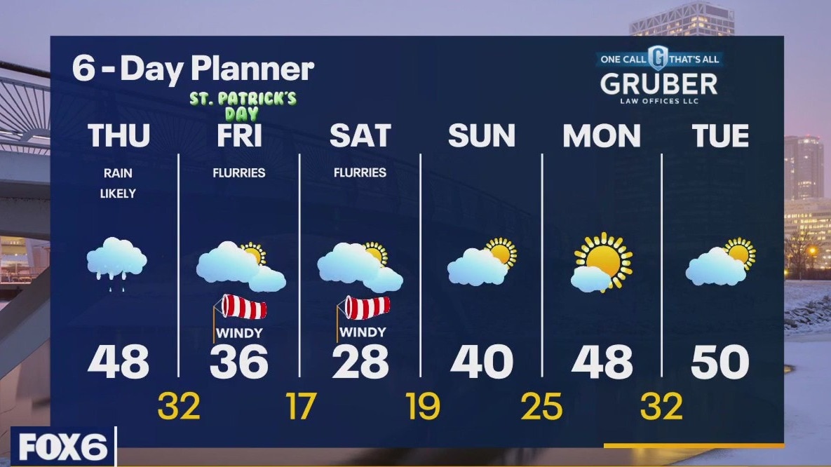 A low arrives today bringing showers by midday and a steadier light rain by this afternoon. Around a half inch of accumulation is expected. Ahead of the low we will warm into the mid to upper 40s and drop to the low 30s as the system exits. As temperatures cool, we may see some snow showers mix into the rain. A few flurries are likely on Friday with a much colder day for St. Patrick's Day. Highs will fall to the mid 30s. We continue to cool for Saturday with temperatures topping out in the upper 20s. We bounce back to near 40 on Sunday and should get to near 50 by Tuesday.