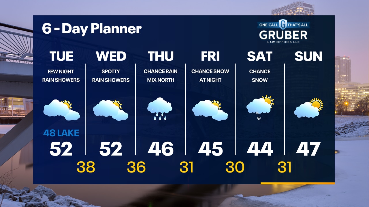 Partly to mostly cloudy tonight with temperatures falling into the 30s. Mostly cloudy and mild again on Tuesday with highs in the 50s inland, upper 40s near the lake.