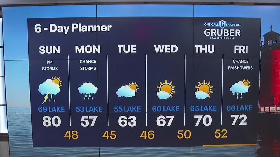 Clouds will gradually clear today allowing sunshine to arrive. Highs in the upper 70s to low 80s. Storms re-enter the forecast tonight into early Monday. Scattered rain Monday with isolated rumbles of thunder. Coolest day of the week in the upper 50s.