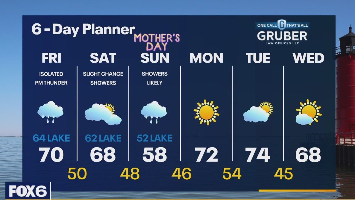 A slow moving low interacts with our region over the next few days bringing periods of rain and a slight chance for a few thunderstorms. Highs today will be near 70 inland but stay in the 60s lakeside. We'll drop to near 50 overnight and only reach the 60s Saturday but the coolest day comes Sunday with highs in the 50s! We should dry up early next week as high pressure reasserts itself. Highs return to the low 70s Monday and Tuesday.