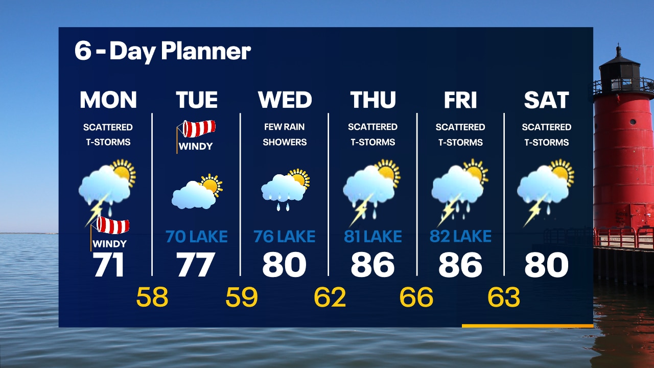 Scattered showers and t-storms will taper off overnight only to redevelop again on Monday. Temperatures in the 60s overnight. Windy and cooler Monday with off-and-on storms and highs in the low 70s.