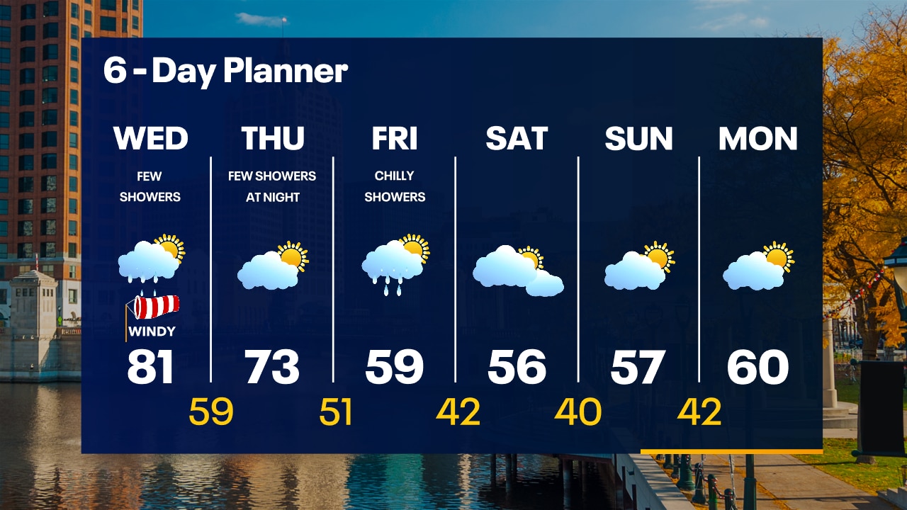 Increasing clouds overnight with temperatures in the 60s. Mostly cloudy with spotty rain showers on Wednesday. It will be windy, warm and humid with a high in the low 80s.