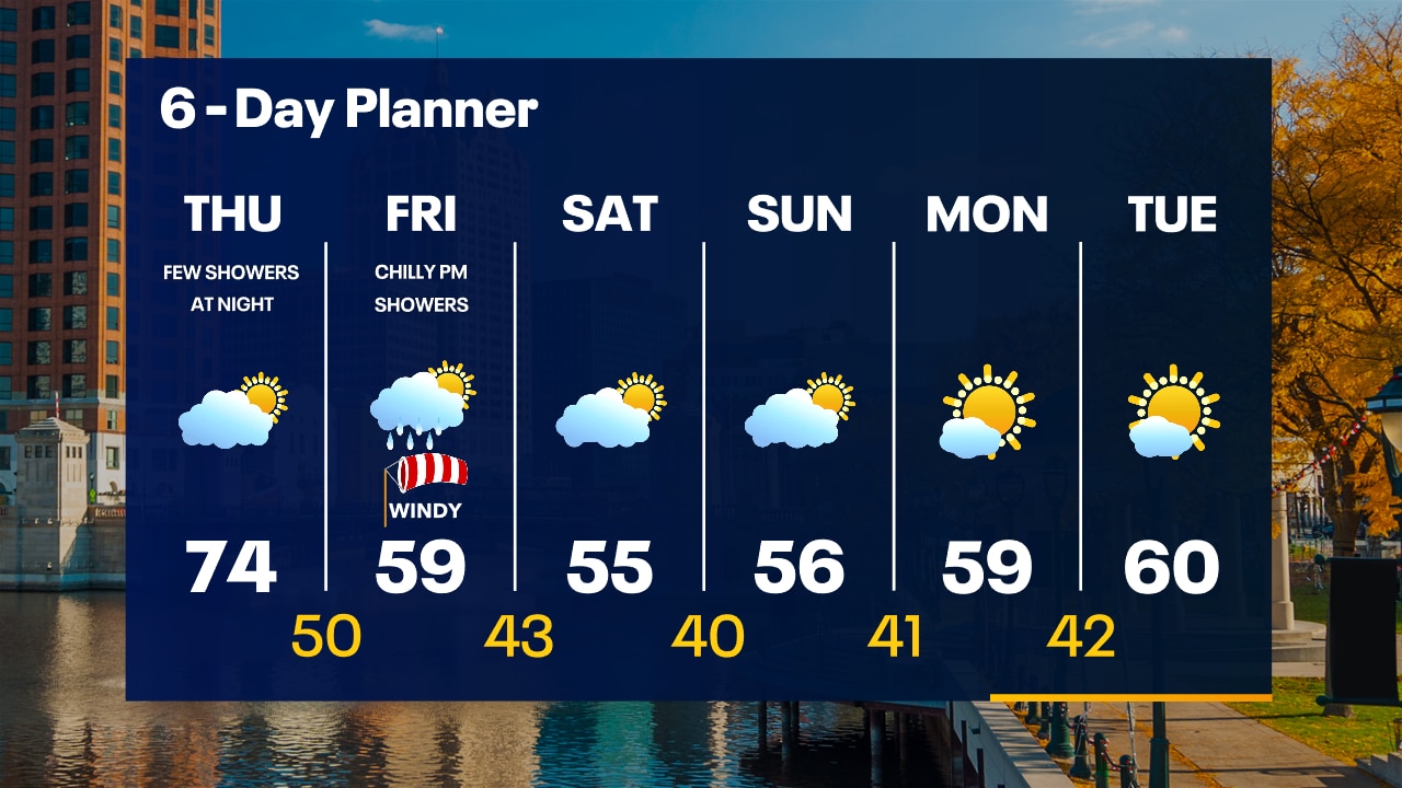 Decreasing clouds overnight with temperatures falling into the 50s. Partly sunny on Thursday with highs in the 70s. A few showers are possible Thursday night.