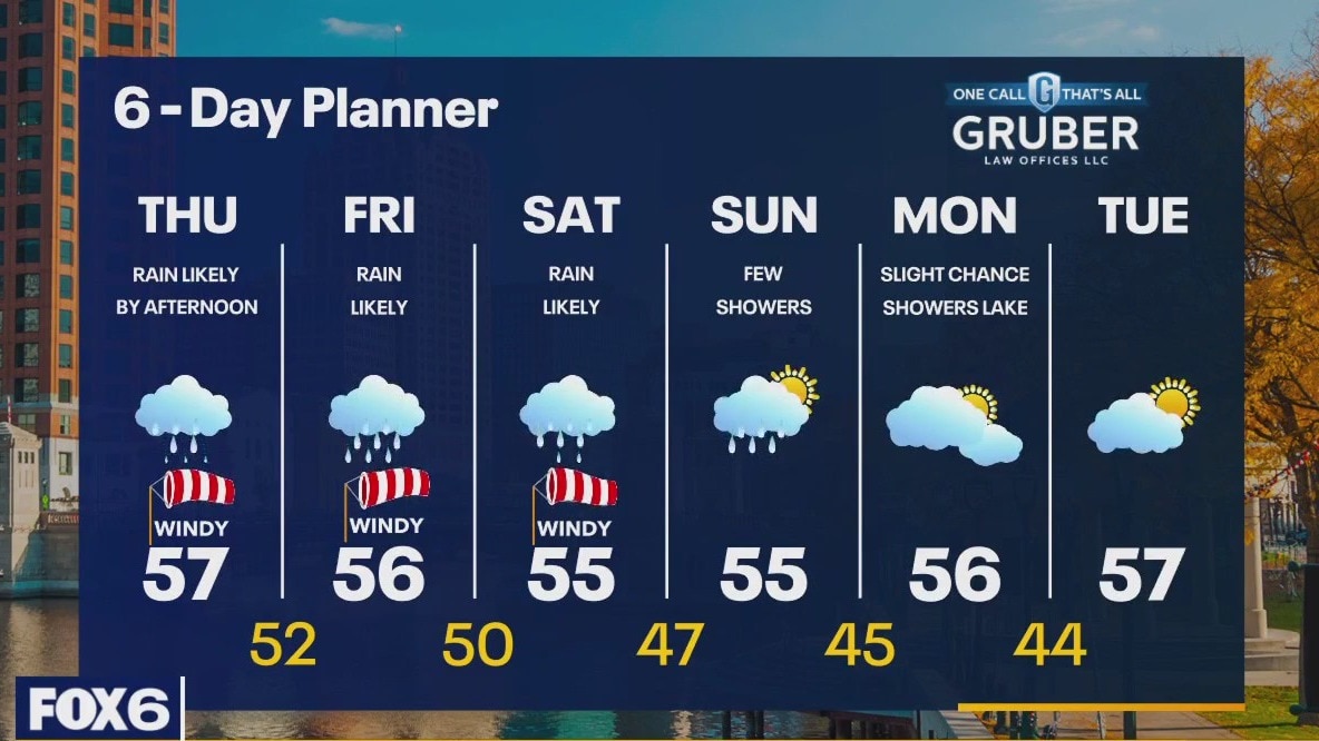 Temperatures in the mid 40s to low 50s Thursday morning. Morning rain will be light and mainly south of Milwaukee. Spotty showers through the day with increasing rain north in the afternoon. Heavy rain moves in Friday afternoon with highs in the 50s and strong winds out of the east. Rain continues on Saturday with lower chances Sunday and Monday. Over 2" of rain possible in spots out of this system.