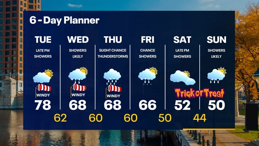 A warm front lifts across our area today pushing temperatures into the mid to upper 70s! A strong southwest wind will gust into the 30mph range at times. A chance for showers returns by later today and tonight with another chance for rain Wednesday. We should see our wettest day on Thursday then dry up as we cool day by the weekend.