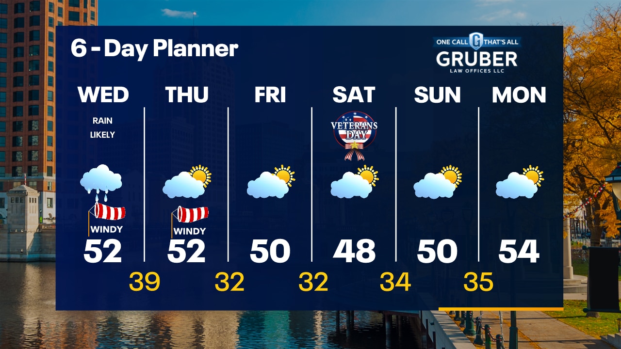 Quiet this evening with rain moving in after 2am. It will be windy on Wednesday morning and rainy for most of the day. Highs in the low 50s.