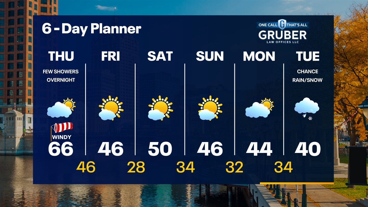 Clear skies tonight with temperatures dropping into the 40s. One more warm day on Thursday. Partly sunny and very windy. Highs in the mid-60s. Much cooler Friday.