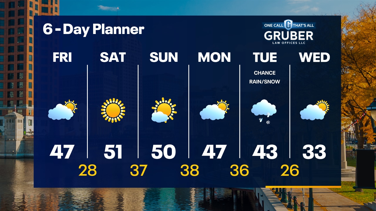 Mild and windy this evening before a cold front comes through overnight. A few rain showers are possible overnight as well. 40s by morning. Highs in the 40s on Friday with decreasing clouds and breezy conditions.