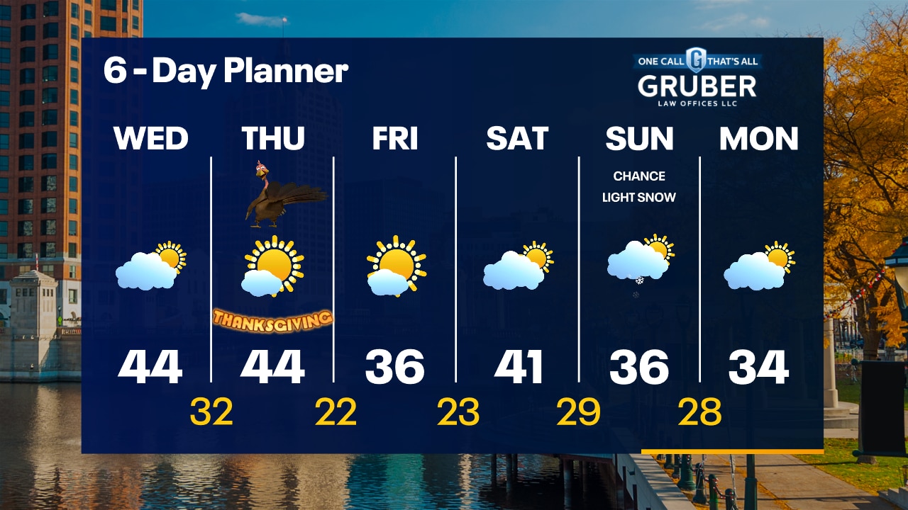 Partly cloudy tonight with temperatures dropping through the 30s. Increasing clouds overnight with temperatures in the upper 20s to low 30s by sunrise. Partly sunny and warmer Wednesday with highs in the mid-40s.