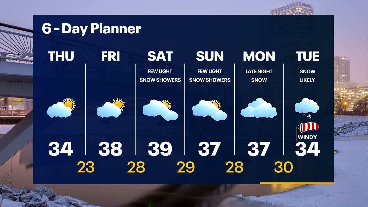 Clouds will gradually clear overnight with temperatures dropping into the 20s. Partly sunny on Thursday with highs in the low-to-mid 30s.