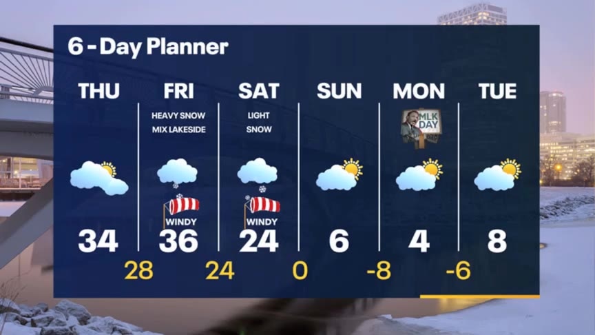 Drying out today after 2-4" of snow last night, but snow returns early Friday morning. There will likely be periods of rain and snow mix lakeside through Friday afternoon then all snow is expected Friday night and colder air filters in. Lake enhancement will also be possible in the evening, thanks to the difference in temperatures. Several inches of snow likely with this system, along with blowing snow.
