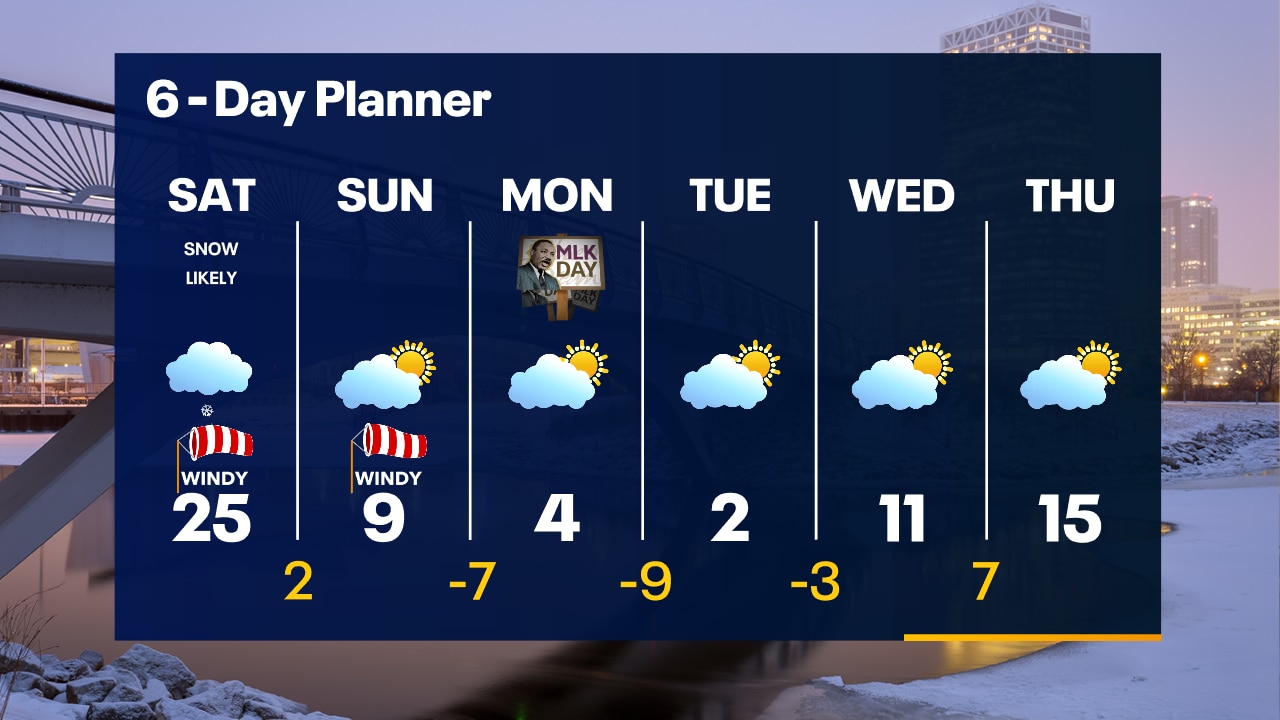 Snow becomes lighter overnight but it will stay windy. Roads will remain slick. Temperatures will drop into the 20s overnight. Around 1" of fluffier snow on Saturday with strong winds and temperatures in the 20s.