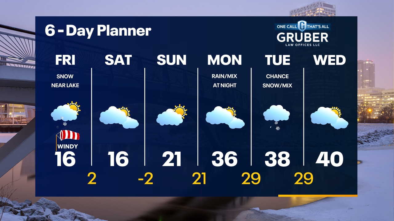 Light snow moving in this evening and moving out around sunrise. Less than 1" north of Milwaukee, around 1" in Milwaukee and 1-2" south. A few snow showers near the lake Friday, with a windy high around 16.