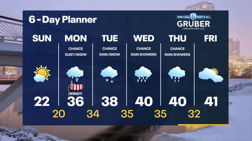 Our last cold, sunny day today then clouds and warmer air arrive Monday. There is a chance for some morning snow/sleet then a more widespread area of rain/snow impacts us Monday night through Tuesday. A few inches of slush will be possible along with a glaze of ice. Rain and 40s by Wednesday.