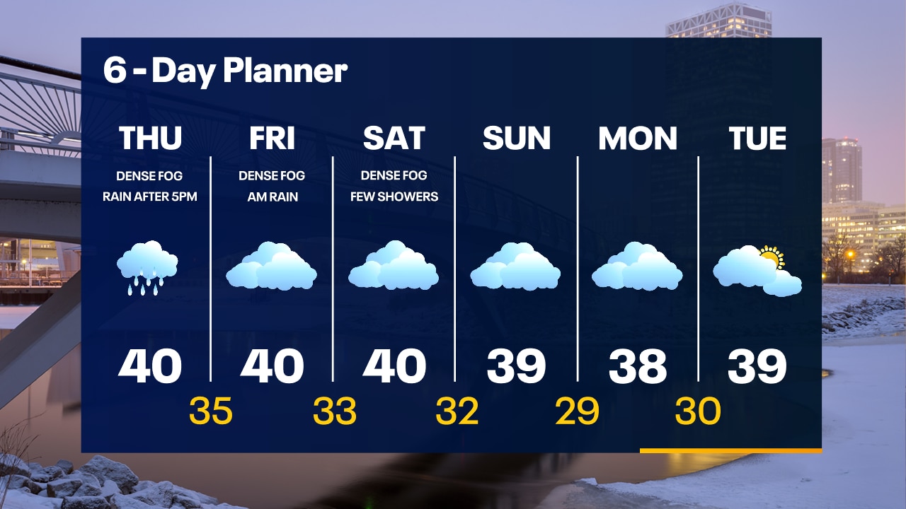 Dense fog overnight with a Dense Fog Advisory until 9am. Foggy all day Thursday with highs around 40. Rain moves in after 6-7pm.