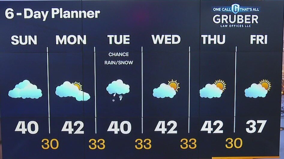 Cloudy with morning fog and drizzle. Cloudy in the afternoon with highs in the upper 30s to 40F. Above average temperatures (+10F) heading into the last few days of January and beginning February. We have a chance to see some sun on Monday, otherwise increasing clouds with a chance for rain/snow mix on Tuesday. Staying mild the rest of the week, but temperatures drop Friday into the middle 30s.