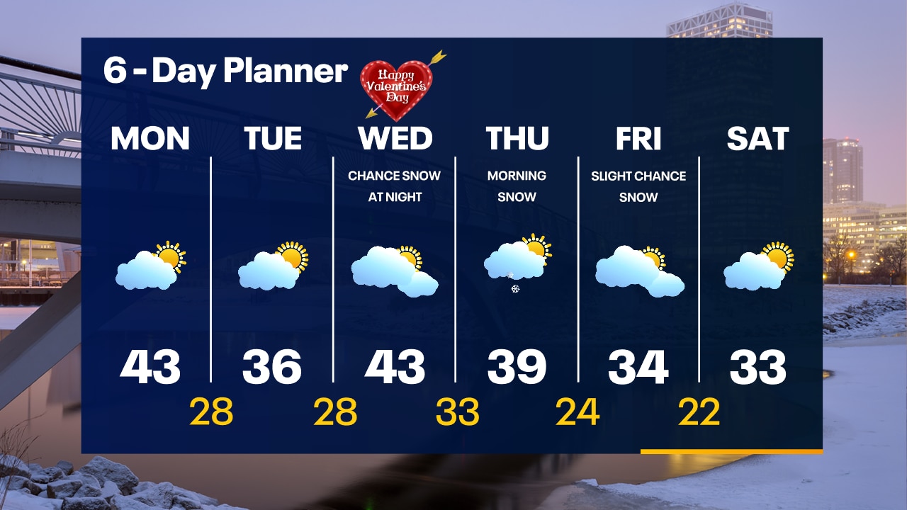 Mostly clear tonight with temperatures falling into the 20s. Partly to mostly sunny on Monday with highs in the low-to-mid 40s. Cooling slightly on Tuesday.