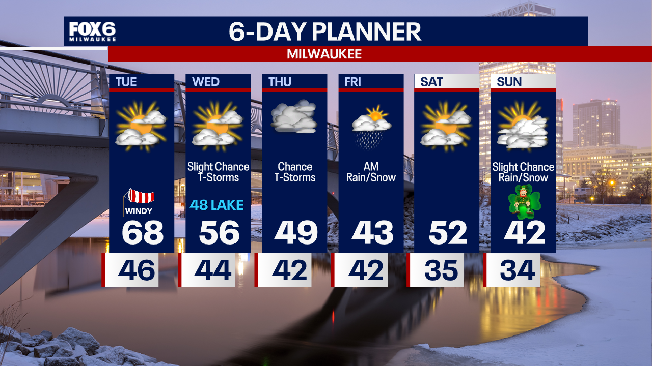 Partly sunny, windy and warm on Tuesday with highs between 65 and 70. Cooler near the lake on Wednesday with rain chances increasing on Thursday.
