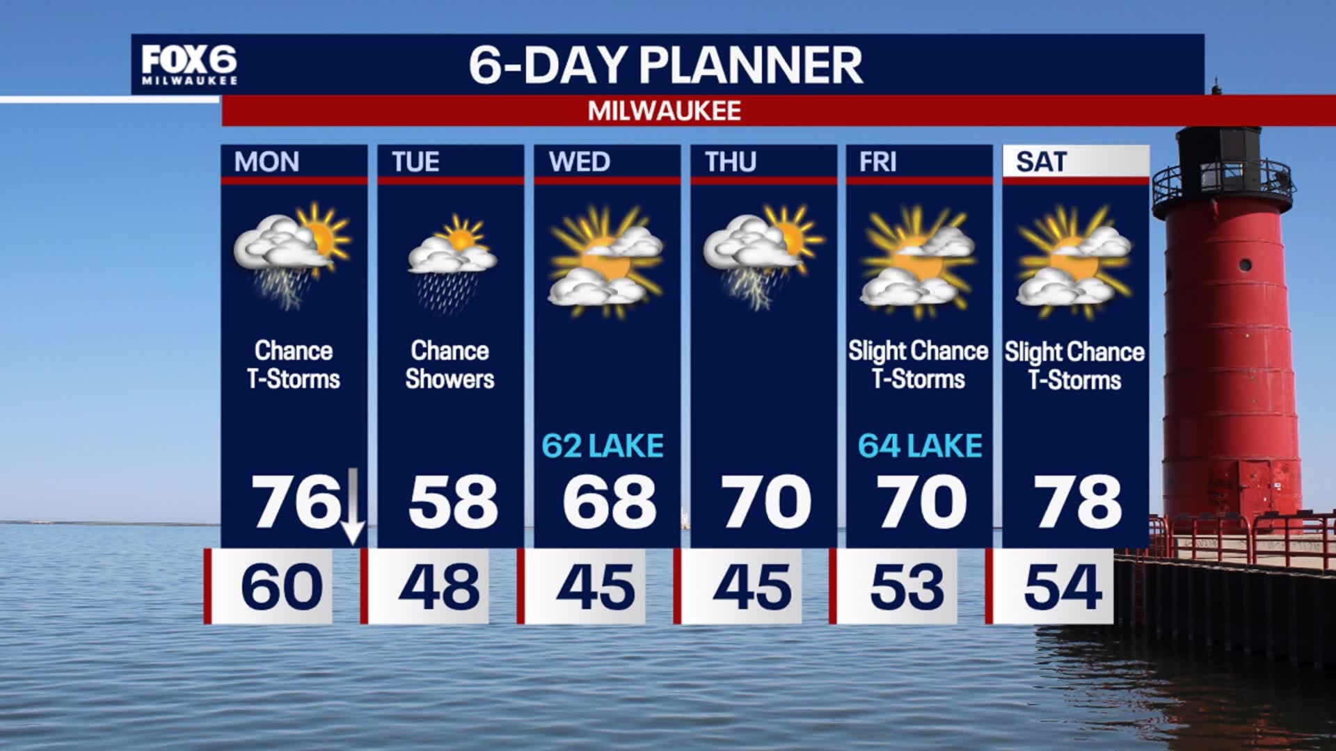 Showers and storms are possible today, along with a big drop in temperatures along the lake. A few showers will linger tonight and Tuesday, then drying out with sunshine on Wednesday. Temperatures will be much cooler Tuesday then jump back to 60s and 70s the rest of the week.