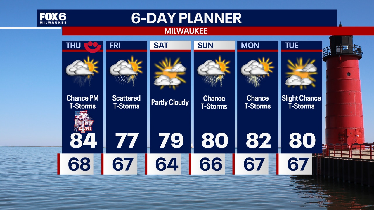 Partly cloudy on the 4th of July. An isolated t-storm is possible during the afternoon and again at night. Highs in the mid-80s inland, cooling into the 70s near the lake during the afternoon.
