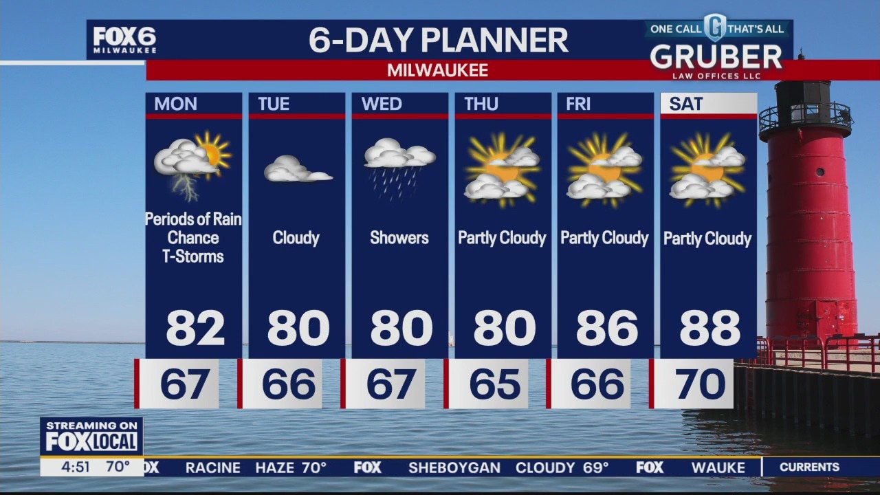 A low moving through the area brings periods of rain and thunderstorms today. Expect seasonal highs in the low 80s with lows in the mid to upper 60s. Tuesday should be a dry day before rain returns Wednesday. Highs will be a bit below the average. A big warm up is expected late week with 90s returning to the area by Sunday.