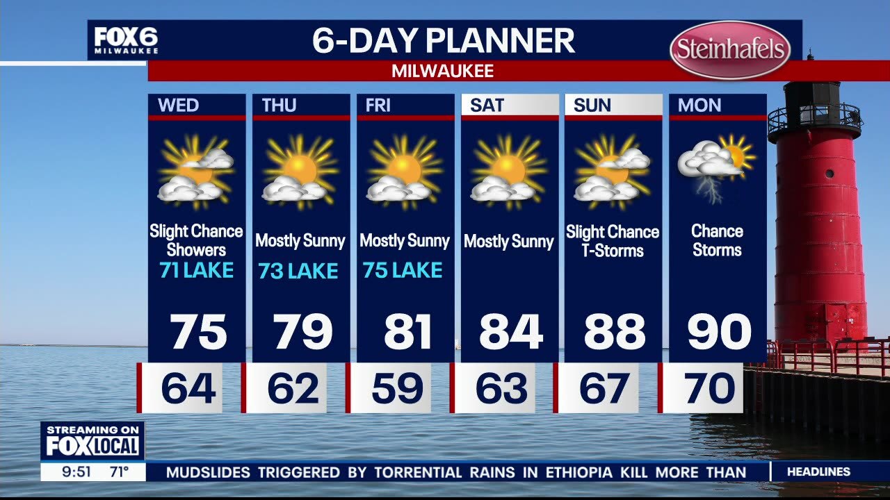 A few showers or storms possible Tuesday night. Non-severe storms expected. Some could have heavy rain. A stray shower possible Wednesday but most areas will begin to dry out. Temperatures will be cooler in the low to mid 70s. Sunny the rest of the week with temperatures near 80F on Friday. Heat and humidity return on Sunday into next week, along with slight chances for storms.