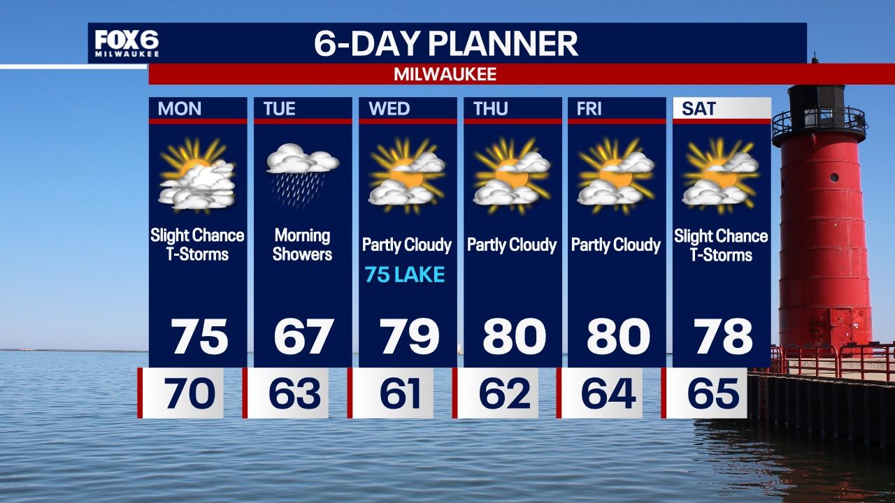 Scattered t-storms are possible overnight with temperatures in the 70s. Cooler but still humid on Monday with a slight chance for t-storms. Highs in the mid-70s. T-Storm chances increase Monday night.