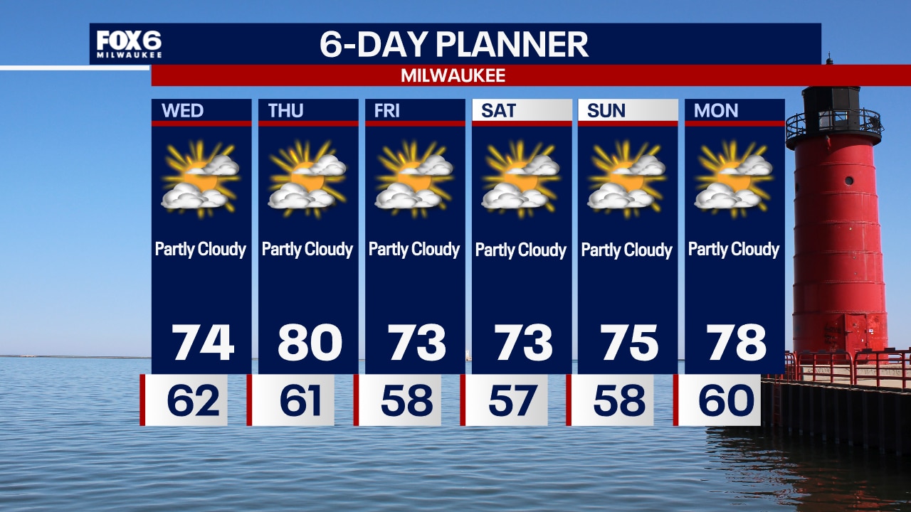 Clearing skies overnight and comfortable. Lows in the mid-50s inland, low 60s near the lake. Partly sunny with lower humidity levels on Wednesday. Highs in the low-to-mid 70s.