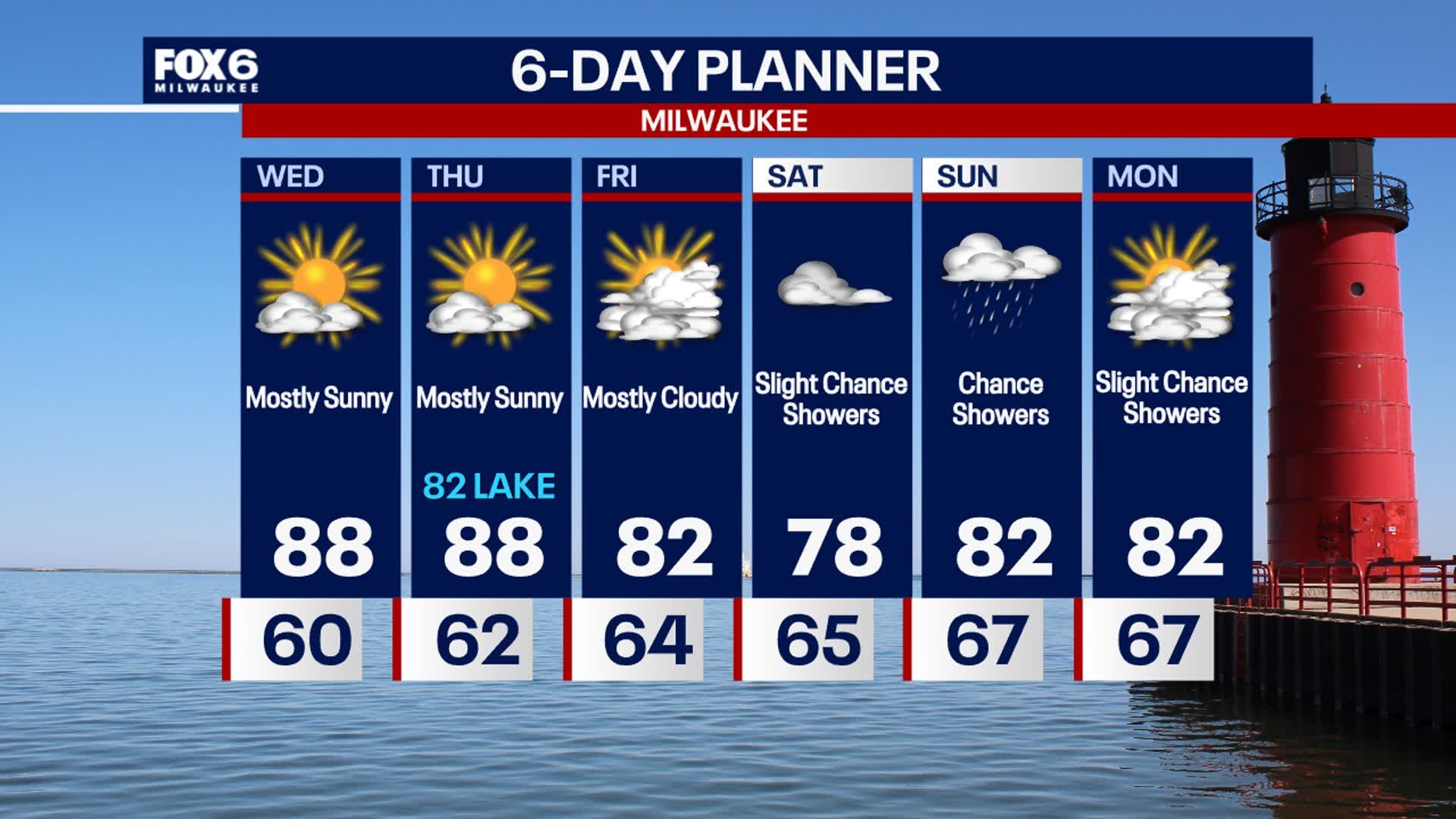 Another hazy day with sunshine and a few cloudy periods. Hotter today with highs in the upper 80s but turning cooler late day lakeside on a SE wind. Staying warmer overnight as well with low to mid 60s for the next few nights. We stay warm and dry Thursday and Friday but we should get a few showers going by late Saturday into Sunday. Temperatures remain above the mid 70s climate averages for the next several days.