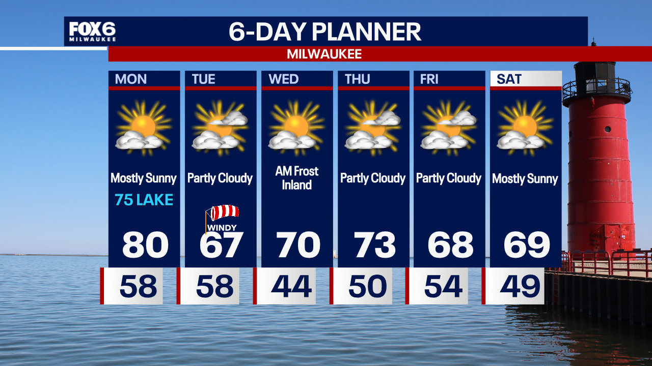 Patchy fog overnight with temperatures dropping into the 50s. Mostly sunny and warm for one more day on Monday. Highs between 75 and 80. Windy and cooler on Tuesday.