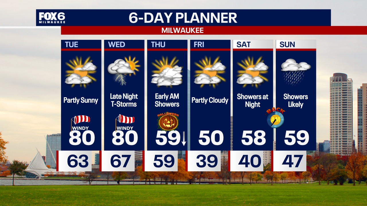 Windy overnight with temperatures rising into the 60s. Partly sunny and very windy on Tuesday with a near-record high around 80.